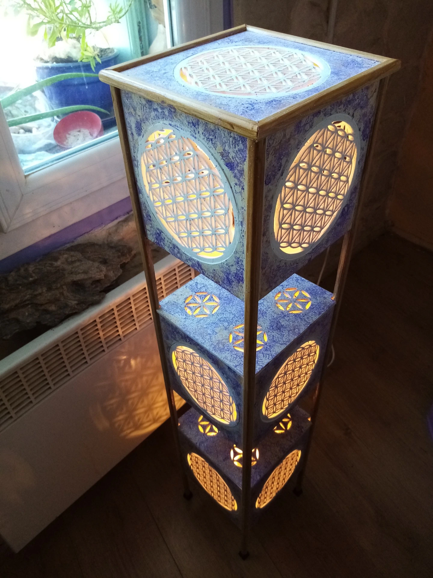 Ces lampes très puissantes vibratoirement (85000 unités bovis.) possèdent 13 fleurs de vie mesurent 1.02m suivant le nombre d'or.